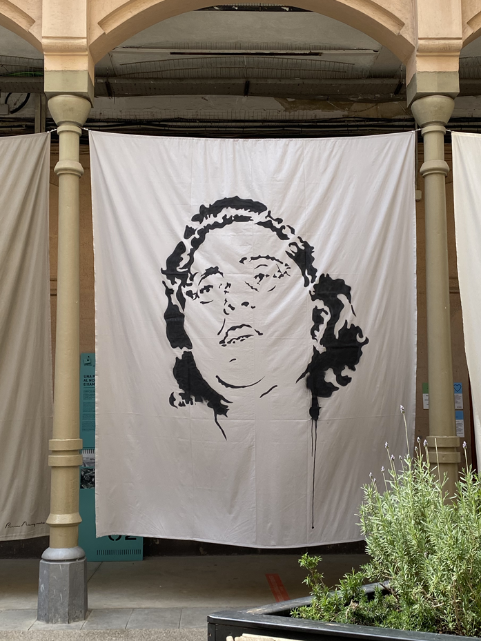 Entrance courtyard of La Model - c/ Entença - Barcelona. Graphic urban art installation in the entrance courtyard of La Model by Pierre Marquès, a French artist living in Barcelona. He painted six large-format portraits of women who stood up for Republican values, even after the Spanish Civil war. Some of them were deprived of their freedom for their defense of the Spanish Republic. The installation includes a QR code that leads you to the biography of these six women, who represent different chronological stages and different profiles of rebellious and committed women: Natividad Yarza Planas, Frederica Montseny i Mañé, Neus Català i Pallejà, Sara Berenguer i Laosa, Maria Salvo i Iborra, and Montserrat Roig i Fransitorra.